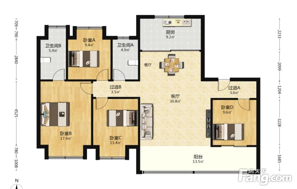 大小面积都采用了双阳台的设计,让房子看起来更宽敞,户型方正,南北通透,动静分离,餐客一体,很好的利用了房子的空间面积。采光无任何遮挡