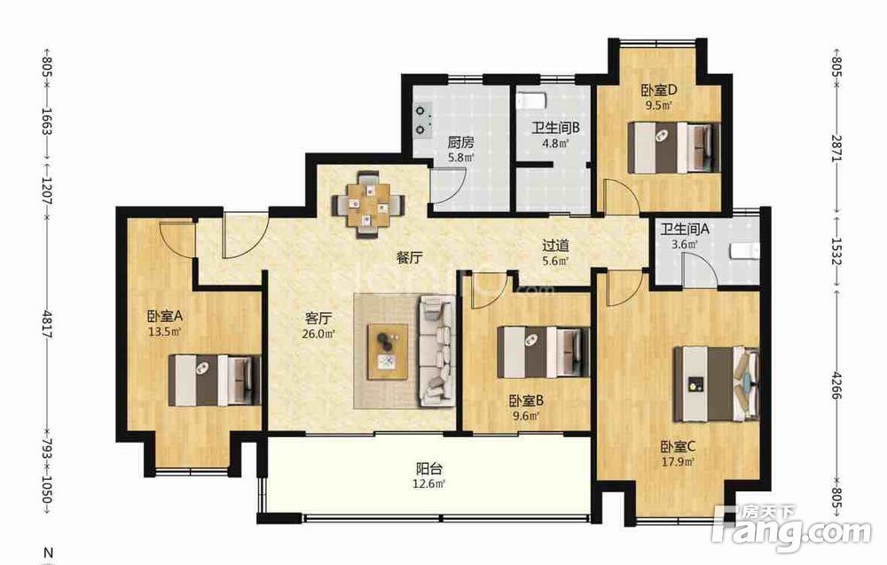 139㎡方正三房两卫,全明通透